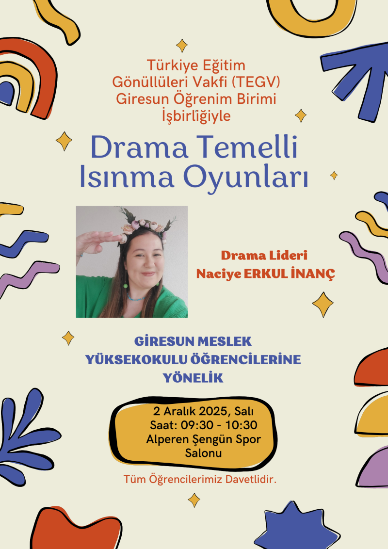 Türkiye Eğitim Gönüllüleri Vakfı (TEGV) Giresun Öğrenim Birimi iş birliğiyle, Giresun Meslek Yüksekokulu öğrencilerine yönelik “ Drama Temelli Isınma Oyunları'' etkinliği gerçekleştirilecektir.